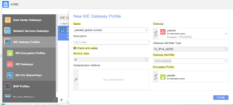 Create an IKE gateway profile.- Enter a Name for the gateway profile.Select Check anti-replay.Select the Service class.Select the Gateway and Encryption Profile, using the settings you created for Prisma Access.The example in the following screenshot uses one pre-shared key per connection, which means that the IKE Gateway profile won't use a pre-shared key object, and the Authentication Method field is empty.