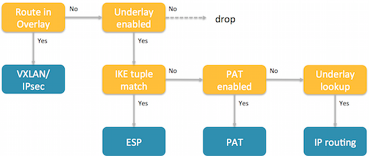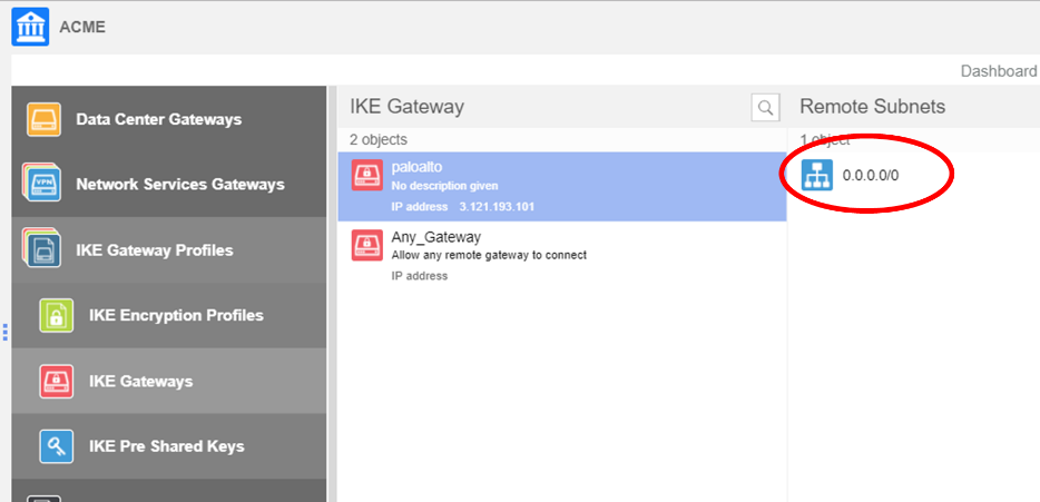Define the remote subnet for which traffic will be sent to the gateway.The IKE gateway connection uses the underlay breakout mechanism as shown in the following diagram: