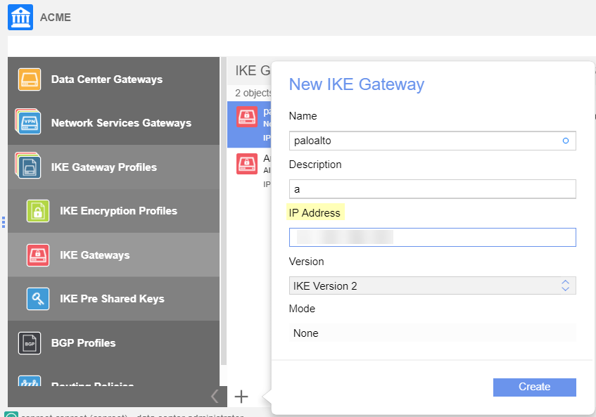 After you configure the remote network tunnel in Prisma Access, configure the tunnel in Nuage Networks by completing the following task.Note that Dead Peer Detection (DPD) is only configured in Nuage Networks. No DPD configuration is required in Prisma Access because the NSG is the DPD initiator and Prisma Access can only reply to requests.- In your organization, create the Gateway using the Nuage Networks IKE gateway object.In the IP Address field, enter the Service IP address that you retrieved after you completed the setup of the remote network tunnel in Prisma Access.