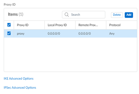 Enable IKE Passive Mode.In the Proxy ID section and Add a default route for all local and remote prefixes.Creating this route ensures that all prefixes in the VPN use this IPSec tunnel.