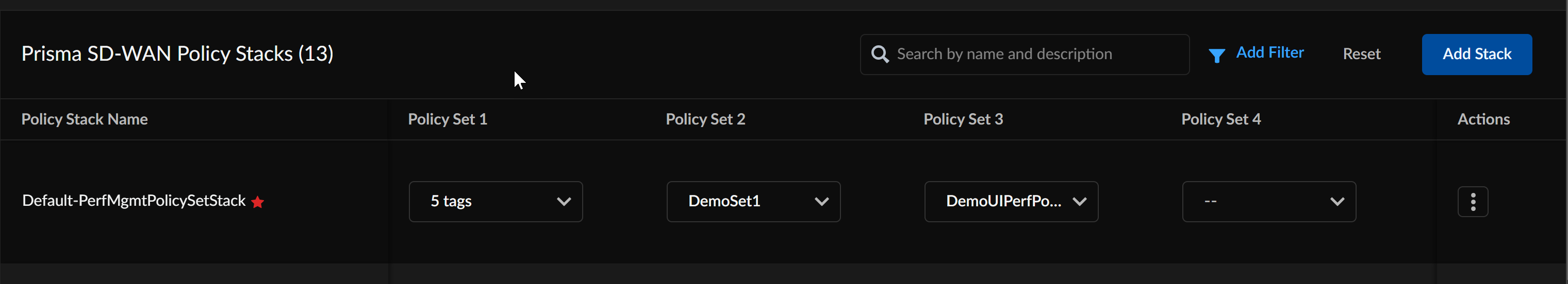 In the Advanced tab, assign performance sets to the policy stack by selecting from the Policy Sets drop down.The policy sets in a stack are ordered from left to right, with the left-most policy set designated as the highest priority.