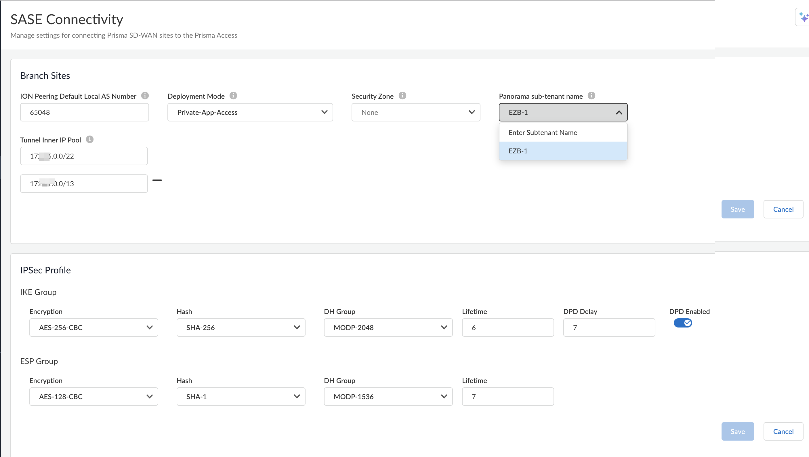 Changes to the Deployment Mode affect only new tunnels or tunnels that have been modified.Specify a Tunnel Inner IP Pool using IP/Mask notation.This IP Pool should be unused or unique across the entire network and should not be used by the Palo Alto Service Infrastructure Subnet.The number of tunnels that can be created in the Prisma SD-WAN Fabric to Prisma Access are directly limited by this configuration. Each tunnel will use a /31 subnet from this pool.(Optional) Select a Security Zone to bind the tunnel(s) created in the onboarding process to the selected zone.If you don’t select a Security Zone, the created tunnels will not be bound to a security zone.(Optional) Select a Panorama tenant from the Panorama sub-tenant name drop-down.You will see this field only if you have a Prisma Access Panorama-managed tenant.Save your changes.(Optional) Update IPSec profiles for the tunnel(s) to Prisma Access.This synchronizes the IPSec profile between Prisma SD-WAN and Prisma Access.