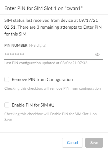 Save Cellular to update the changes.Enter the SIM PIN to Unlock the SIMThe SIM PIN prevents unauthorized use of SIM cards. With SIM PIN enabled, a SIM is locked to a modem. A PIN code is required to unlock the SIM for the modem to access the cellular network and start data sessions.The entered PIN is saved in the ION device and this PIN is used for PIN verification when the ION device is reset. PIN verification is not required for an unlocked SIM.- Select the ellipsis icon against the SIM and select Enter PINEnter the PIN Number for the SIM.![]() The check box Remove PIN from Configuration is deselected by default. When deselected, the PIN is used to secure the SIM. You cannot use the SIM until the SIM PIN is configured.Enable PIN for SIM#1 to enable the PIN for the selected slot.Save to save the configuration. The check box Remove PIN from Configuration is deselected by default. When deselected, the PIN is used to secure the SIM. You cannot use the SIM until the SIM PIN is configured.Enable PIN for SIM#1 to enable the PIN for the selected slot.Save to save the configuration.