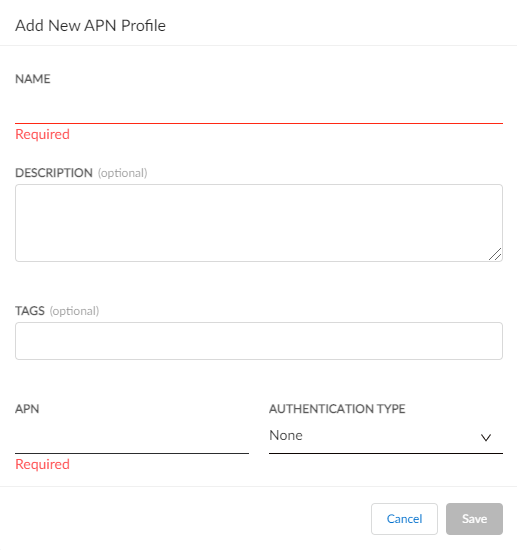 - Select ConfigurationPrisma SD-WANProfiles and TemplatesAPN.Create APN Profile.Enter a Name for the profile.![]() (Optional ) Add a Description and Tags for the profile.Enter the APN details.Based on the SIM, you may need to configure a specific APN to get the cellular connection up and maintain different APNs. Contact your cellular carrier for support.Select the Authentication Type.Select from the available options PAP, CHAP, or PAP/CHAP.(Optional) Configure the User name and Password given by the cellular carrier.Save the changes. (Optional ) Add a Description and Tags for the profile.Enter the APN details.Based on the SIM, you may need to configure a specific APN to get the cellular connection up and maintain different APNs. Contact your cellular carrier for support.Select the Authentication Type.Select from the available options PAP, CHAP, or PAP/CHAP.(Optional) Configure the User name and Password given by the cellular carrier.Save the changes.