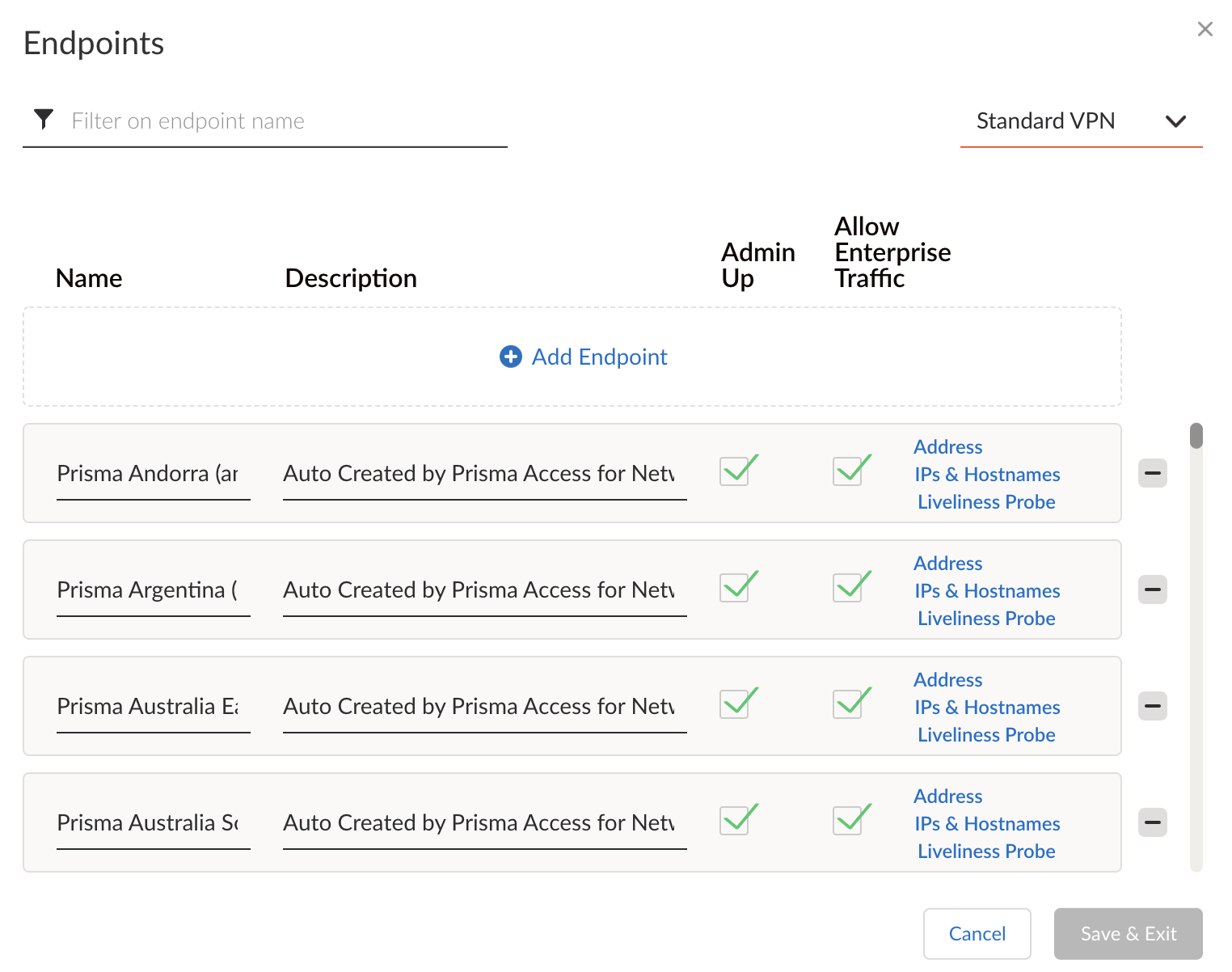 CloudBlade, standard endpoints for all Prisma Access regions will be created