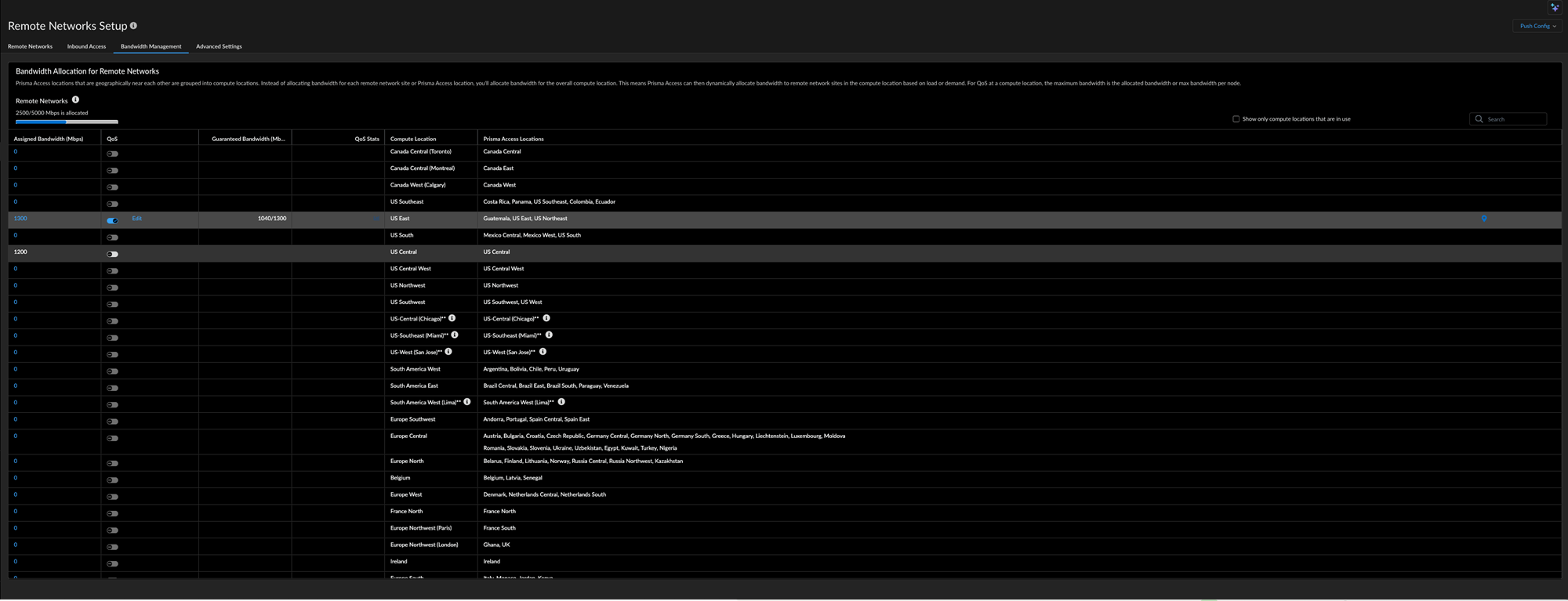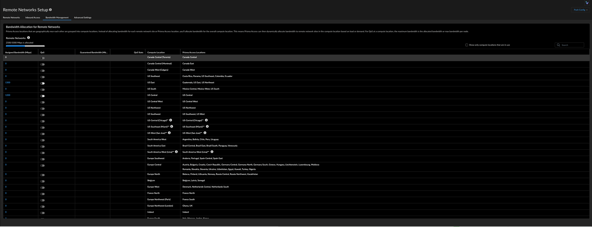 Go to ConfigurationNGFW and Prisma AccessRemote NetworksBandwidth Management and view the which Prisma Access, regions are configured to allocate