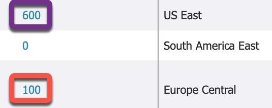 If looking at two locations, namely US East (purple box), and Europe Central (orange