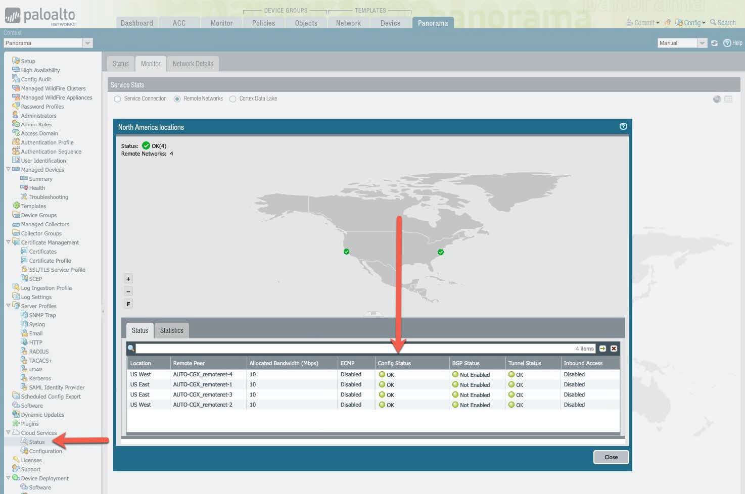 Verify the status of all tunnels via Cloud Service pluginStatusMonitorRemote Networks.