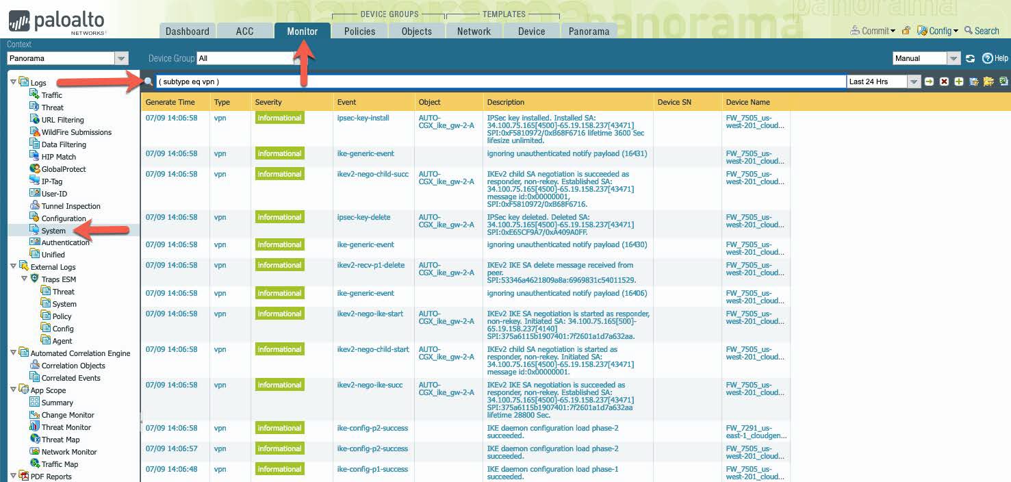 For more details check the logs for IPsec and IKE negotiation messages under MonitorSystem with the filter (subtype eq vpn) applied.