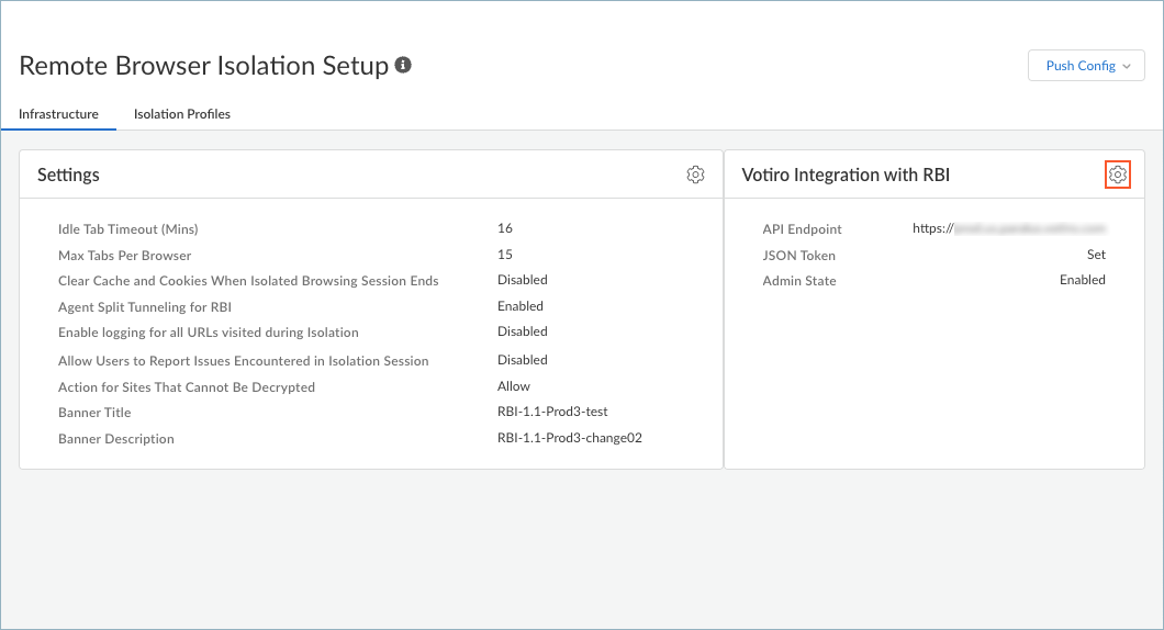 - In Strata Cloud Manager, select ConfigurationNGFW and Prisma AccessConfiguration ScopeGlobalSetup and select the Remote Browser Isolation settings.If you are integrating Votiro with RBI for the first time, click Set Up Votiro Integration. Otherwise, edit the Votiro integration settings.