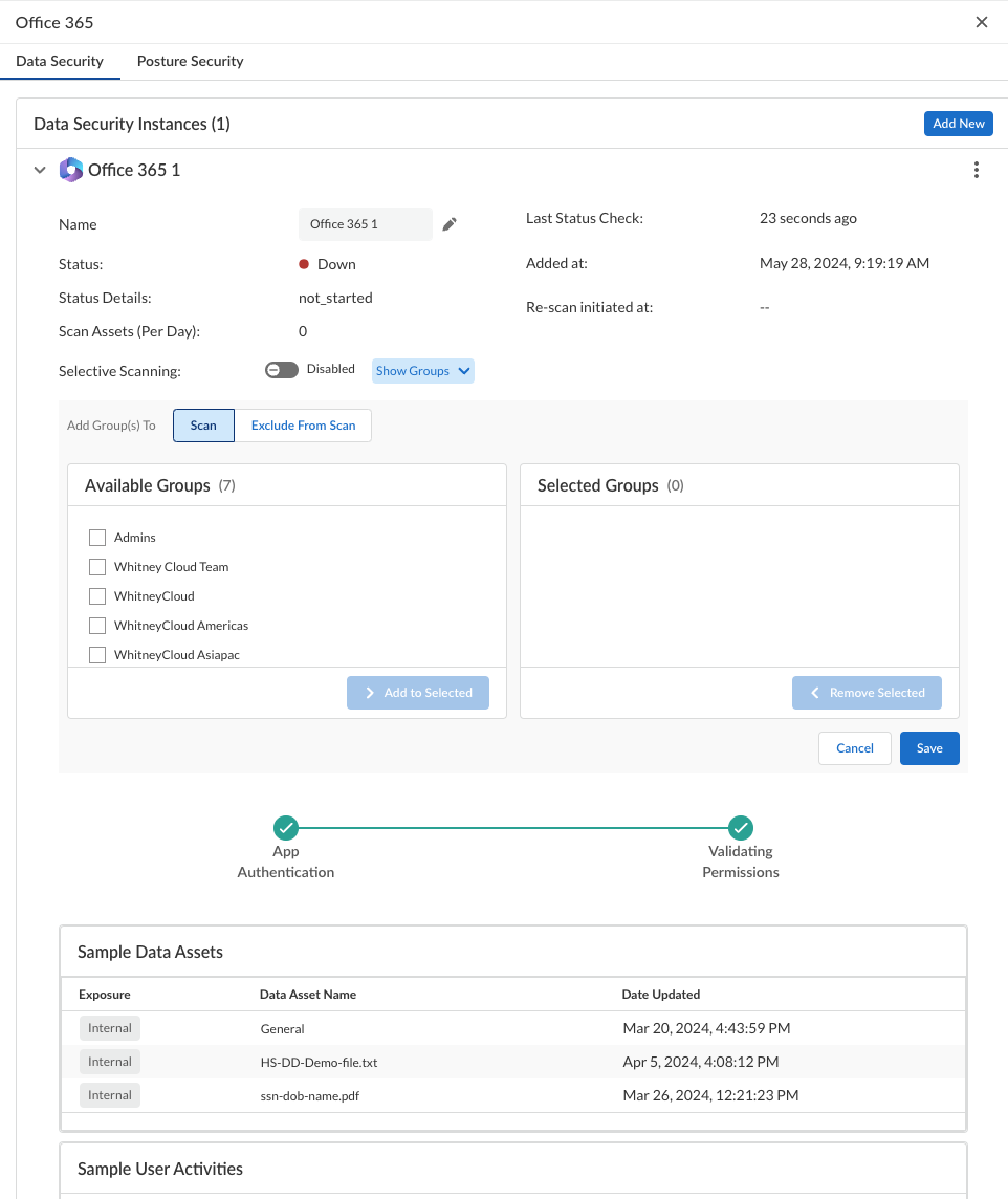 After the validation is successful, Data Security displays sample assets and sample activities.If you don't have any subscriptions, you will not see any User activities in the validation page. It might take up to 12 hours for the first content blobs to become available. For more information, see Office 365 Management Activity API reference.If the App Authentication or Validating Permissions check fails, try the following:- Ensure you have administrator permissions.