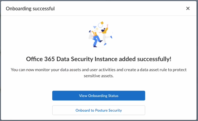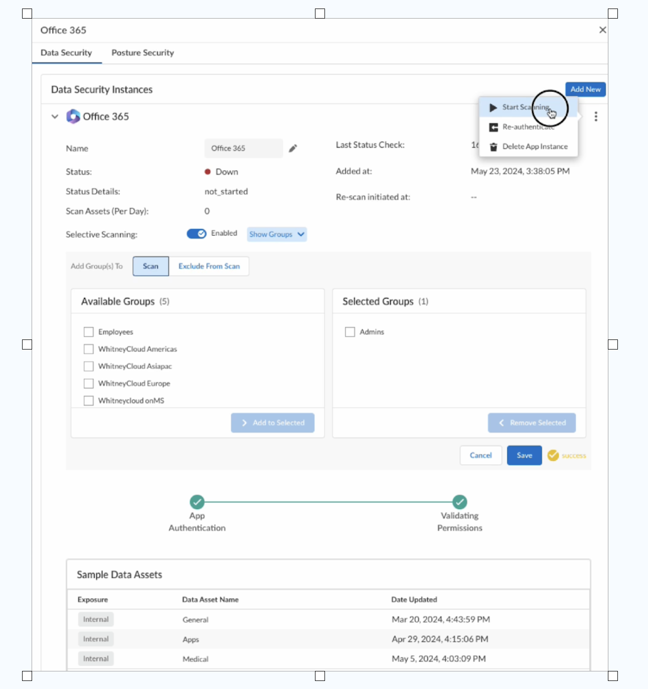 Fix Onboarding IssuesTo ensure that your app has onboarded correctly without any issues in authentication or permissions, Data Security performs validation checks between the onboarding and scanning process. You can start scanning only after a successful validation. For Office 365, the following two validations happen:- App Authentication