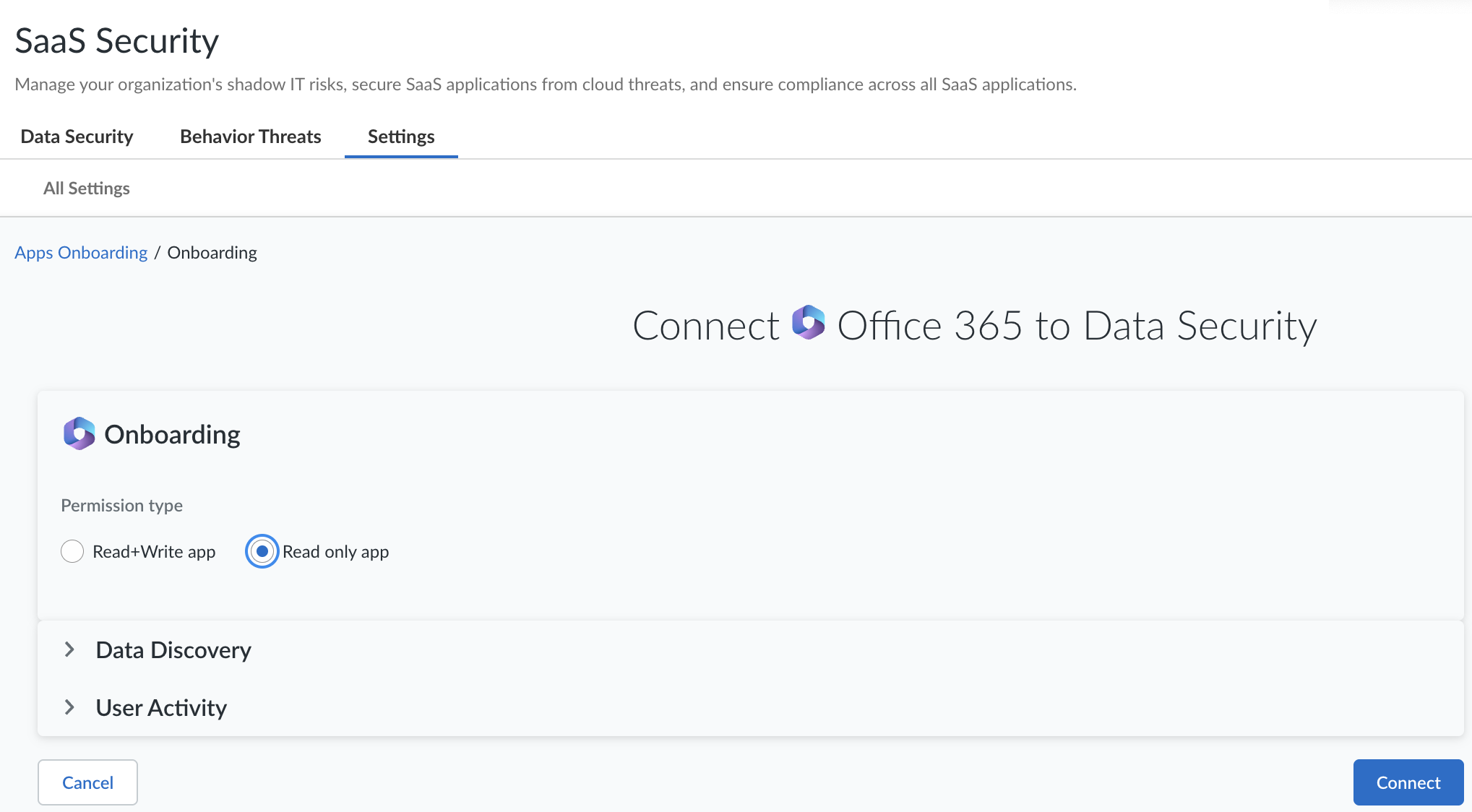 Add your Office 365 app- Log in to Strata Cloud Manager.Select ManageConfigurationSaaS SecurityData SecurityApplicationsAdd ApplicationOffice 365. Click on the tile.