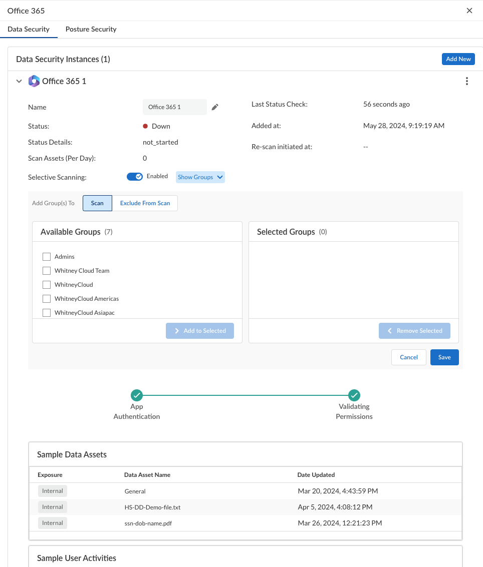 Perform selective scanning on your Office 365 app. You can perform this procedure any number of times and make any changes as long as you have not started scanning your Office 365 app. However, if you have started scanning, all operations related to selective scanning are disabled.- Enable group-based selective scanning.If you have not already done so, instruct Data Security to retrieve your Azure AD group information. Or, Integrate Cloud Identity Engine with Data Security if you plan to use selective scanning before adding your application so that Data Security can discover and scan assets belonging to the user groups you want to monitor. Then return to this step to choose the user groups.You can choose to either Scan or Exclude From Scan your user groups.Choose your groups from the Available Groups list and move them to the Selected Groups list.Save your settings.