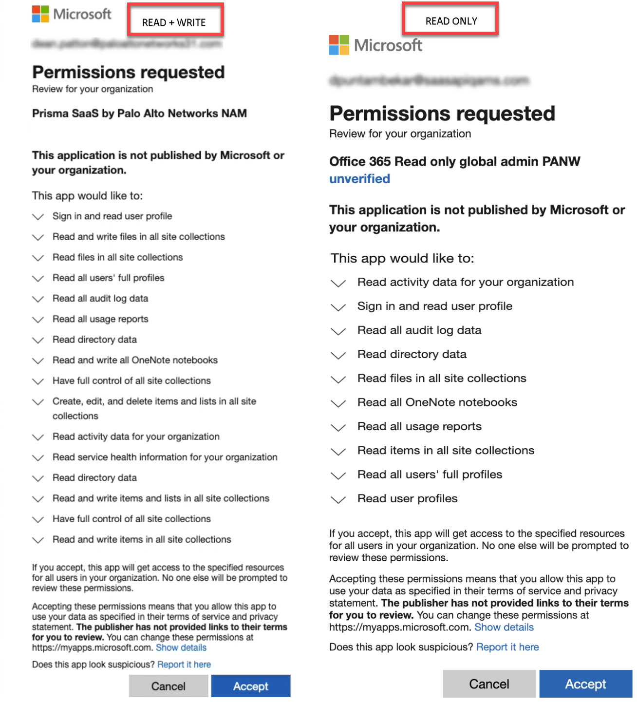 Enter the login credentials for the account with Global admin role privileges on the Microsoft online page to which Data Security redirects you.Review and Accept the permissions requested.The permissions requested are different for onboarding using the Read + Write and Read Only permissions. Data Security requires these permissions to scan your assets on Office 365.