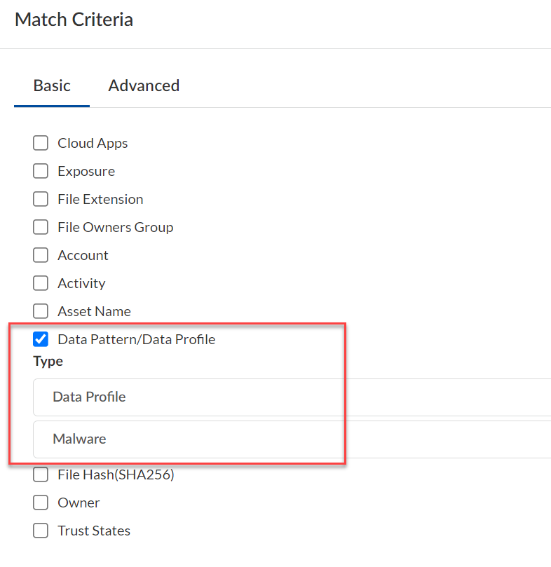 Data Security integrates with WildFire by using a predefined data pattern and predefined policy rule (WildFire).- Before you begin: Enable Contextual Information.Specify the WildFire Data Pattern or Malware Data Profile as match criteria in your policies.If you forget to specify the data pattern or data profile, your match results will not be accurate—they will include a large number of false positives.