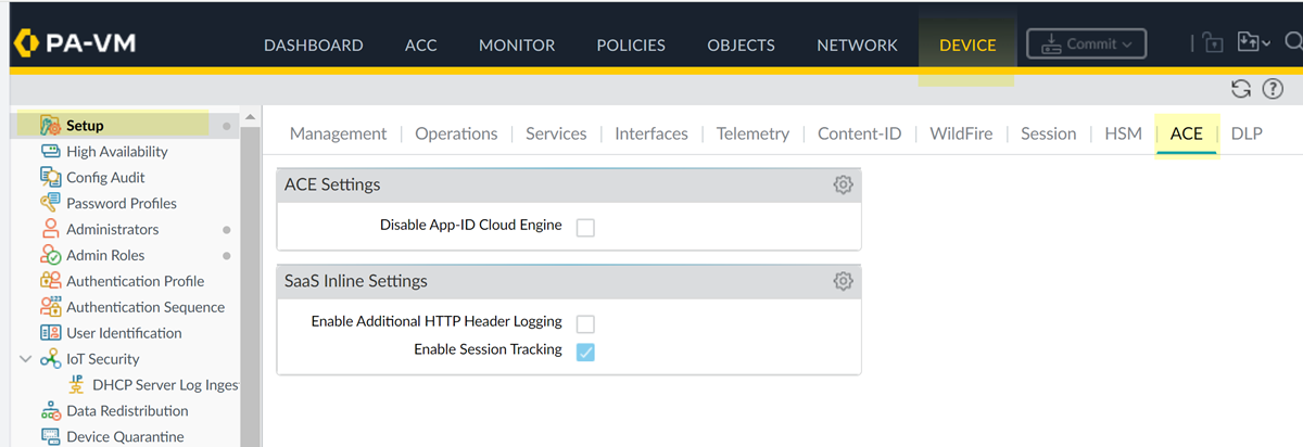 Because SaaS Security Inline is the only consumer of the additional header logging and session tracking information, and because you might not require tenant-level policy rules for these apps, these settings are disabled by default. The apps for which additional header logging or session tracking is required are identified in the following table's Additional Requirements column.To enable additional HTTP header logging or session tracking on the NGFW, complete the following steps. To enable additional HTTP header logging, the NGFW must be running PAN-OS 11.2.3 or later. To enable session tracking, the NGFW must be running PAN-OS 11.2.5 or later.- Select DEVICESetupACE.