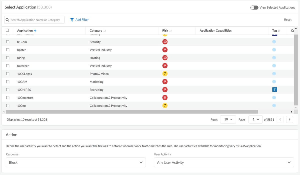 - Specify the apps that you want to control.You can only create recommendations for enforcement on your NGFW for SaaS apps that have an App-ID. You can determine if a given SaaS app in the Application Dictionary has an App-ID based on its How is this app detected? attribute.Use the filters (such as the Category and Risk filters) to help you locate the SaaS apps so that you capture all the app SaaS Applications. For example, if your intent is to only include high risk SaaS apps, filter by risk.For a rule to take action on a SaaS app, the user activities you choose must be supported by all the SaaS apps you select. User activities are unique to each SaaS app. For example, if a SaaS app does not provide a means for a user to upload a file, your rule can’t include that user activity. The SaaS Security Inline web interface returns an error when you select a user activity that the SaaS app does not support. Use the Capabilities matrix to help you determine which user activities the SaaS apps support.