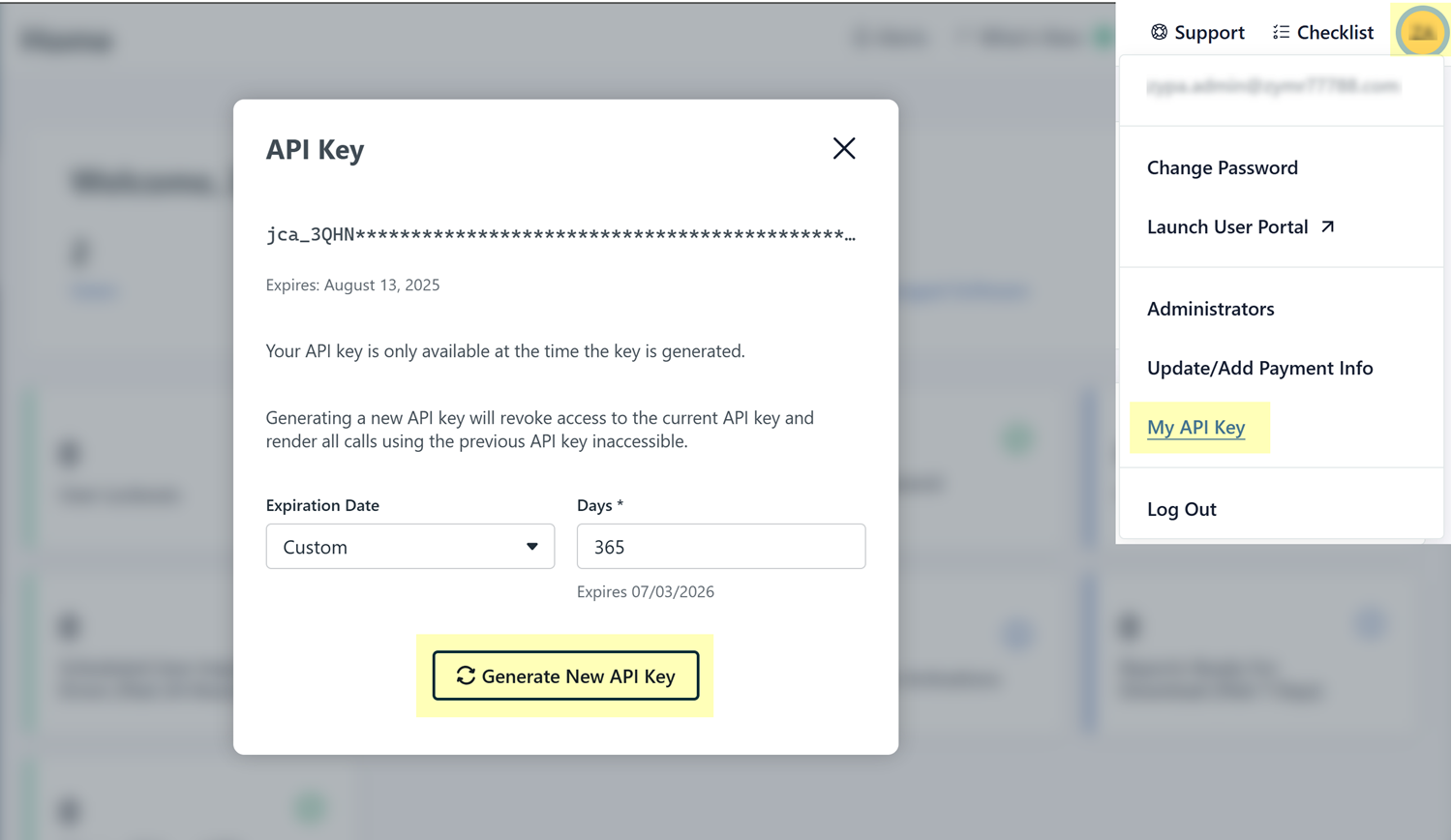 - Identify the JumpCloud account that you will use to create the API key.Required Permissions: To create the API key, you must use an account that is assigned to the Administrator role in JumpCloud. The account must have API access enabled. To enable API access for the Administrator account, contact an administrator assigned to the Administrator with Billing role. Only administrators assigned to the Administrator with Billing role can enable API access for an Administrator account.The API key will inherit the permissions of the Administrator account.Using the credentials of the Administrator account, log in to the JumpCloud Admin Portal.Locate your profile icon in the upper-right corner of the page and select <profile-icon> My API Key.In the API Key dialog, specify a Custom expiration date of 365 days, and Generate New API Key.