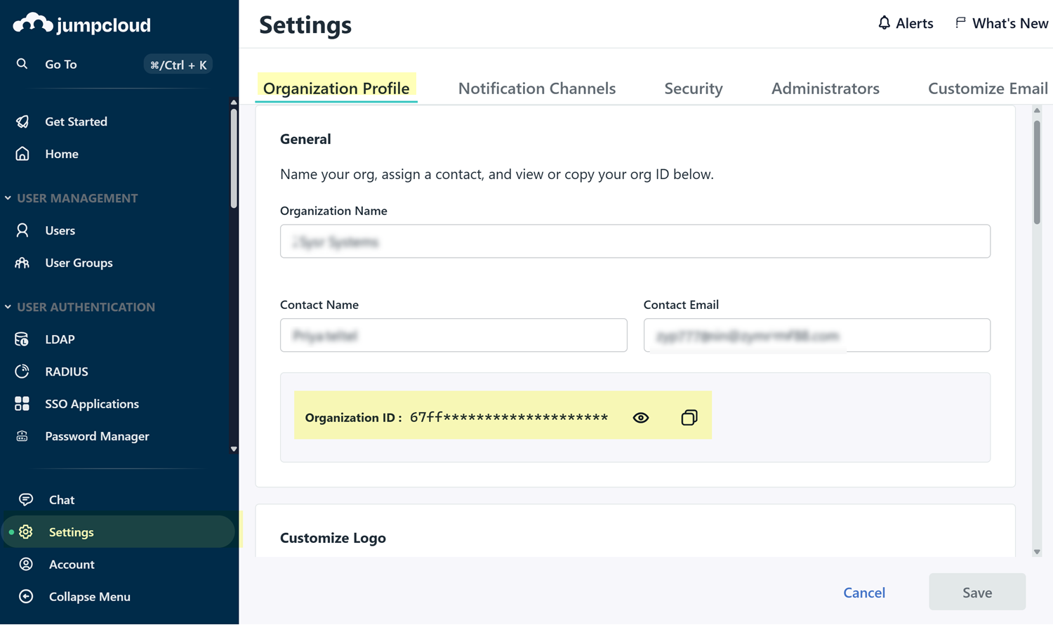 JumpCloud generates and displays a new API key.Copy the API key and paste it into a text file.Don’t continue to the next step unless you have copied the API key. You must provide this key to SSPM during the onboarding process.Identify your Organization ID. To retrieve your JumpCloud Organization ID, complete the following steps:- In the JumpCloud Admin Portal, navigate to your Settings page. To navigate to the Settings page, in the lower-left corner of the Admin Portal, click Settings.On the Settings page, navigate to the Organization Profile tab.Copy your Organization ID and paste it into a text file.Don't continue to the next step unless you have copied the Organization ID. You must provide this information to SSPM during the onboarding process.