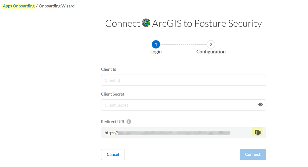 - Log in with Credentials.A connection page for onboarding an ArcGIS instance is displayed. The Redirect URL field displays the redirect URL value.