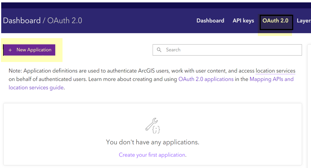 Identify the administrator account that you will use to create your OAuth 2.0 application.Required Permissions: The OAuth 2.0 application must be created by an ArcGIS administrator.Create your OAuth 2.0 application.- Open a web browser and go to the ArcGIS Developer page at developers.arcgis.com.