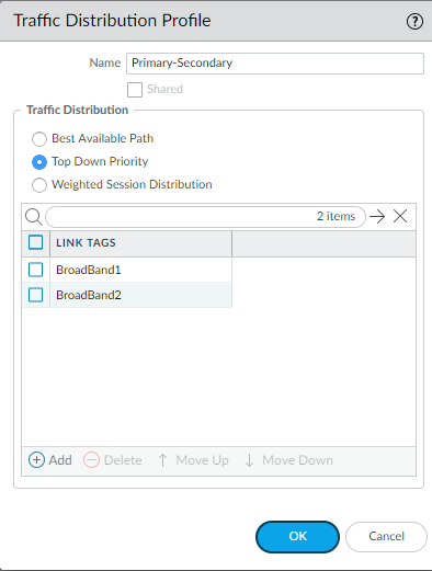 Select Shared only if you want to use this traffic distribution profile across all Device Groups (both hubs and branches).Select one traffic distribution method and add a maximum of four Link Tags that use this method for this profile.- Best Available