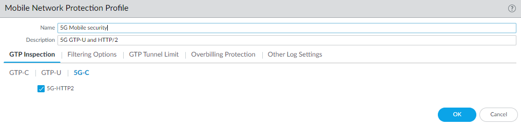 - Enable GTP security.- Select DeviceSetupManagementGeneral Settings. Select GTP Security.Click OK.Commit the change.Select DeviceSetupOperations and Reboot Device.Enable inspection of 5G HTTP/2 control packets; create a Mobile Network Protection profile.- Select ObjectsSecurity ProfilesMobile Network Protection.Add a profile by Name, for example, 5G Mobile security.Enter a Description.On the GTP Inspection tab, select 5G-C.Enable 5G-HTTP2 to enable inspection of 5G HTTP/2 control packets.![]() Select GTP-U and enable GTP-U Content Inspection to correlate context from 5G HTTP/2 control packets (Subscriber IDs and Equipment IDs) to IP user traffic inside a GTP-U tunnel.Select Filtering Options and RAT Filtering; for example, you can allow NR (New Radio) and block other RATs. Select GTP-U and enable GTP-U Content Inspection to correlate context from 5G HTTP/2 control packets (Subscriber IDs and Equipment IDs) to IP user traffic inside a GTP-U tunnel.Select Filtering Options and RAT Filtering; for example, you can allow NR (New Radio) and block other RATs.![]() Select IMSI Filtering and Add one or more IMSI Prefix(es) with the desired action.Select APN Filtering and Add one or more APNs with the desired action.(Optional) To troubleshoot, select Other Log Settings and select 5G Allowed Messages N11 (the HTTP/2 control messages). You can also enable GTP-U Allowed Messages for Tunnel Management, Path Management, and G-PDU. You can Log User Location.Click OK.Create address objects for the IP addresses assigned to the network elements in your topology, such as the AMF on the N11 interface, the gNB on the N3 interface, the SMF on the N11 interface, and the UPF on the N3 interface.Create a Security policy rule that applies your Mobile Network Protection profile to application traffic. Select IMSI Filtering and Add one or more IMSI Prefix(es) with the desired action.Select APN Filtering and Add one or more APNs with the desired action.(Optional) To troubleshoot, select Other Log Settings and select 5G Allowed Messages N11 (the HTTP/2 control messages). You can also enable GTP-U Allowed Messages for Tunnel Management, Path Management, and G-PDU. You can Log User Location.Click OK.Create address objects for the IP addresses assigned to the network elements in your topology, such as the AMF on the N11 interface, the gNB on the N3 interface, the SMF on the N11 interface, and the UPF on the N3 interface.Create a Security policy rule that applies your Mobile Network Protection profile to application traffic.- Select PoliciesSecurity and Add a Security policy rule by Name.Select Source tab and Add a Source Zone or select Any.For Source Address, Add the address objects for the 5G element endpoints on the N3 and N11 interfaces that you want to allow.![]() For Destination, Add the Destination Address address objects for the 5G element endpoints on the N3 and N11 interfaces that you want to allow (the same ones you allowed for Source Address).Add the Applications to allow, such as the user plane, which is gtp-u and web-browsing, which has HTTP/2.On the Actions tab, select the Action, such as Allow.Select the Mobile Network Protection profile you created.Select other profiles you want to apply, such as Vulnerability Protection.Select Log Settings, such as Log at Session Start and Log at Session End.Click OK.Create another Security policy rule based on Network Slices, for example, to allow applications for a standardized or operator-specific SST. For Destination, Add the Destination Address address objects for the 5G element endpoints on the N3 and N11 interfaces that you want to allow (the same ones you allowed for Source Address).Add the Applications to allow, such as the user plane, which is gtp-u and web-browsing, which has HTTP/2.On the Actions tab, select the Action, such as Allow.Select the Mobile Network Protection profile you created.Select other profiles you want to apply, such as Vulnerability Protection.Select Log Settings, such as Log at Session Start and Log at Session End.Click OK.Create another Security policy rule based on Network Slices, for example, to allow applications for a standardized or operator-specific SST.- Select PoliciesSecurity and Add a Security policy rule by Name.Select Source and Add one or more Network Slices in either of the following formats:- Standardized SST (select eMBB, MIoT, or URLLC).