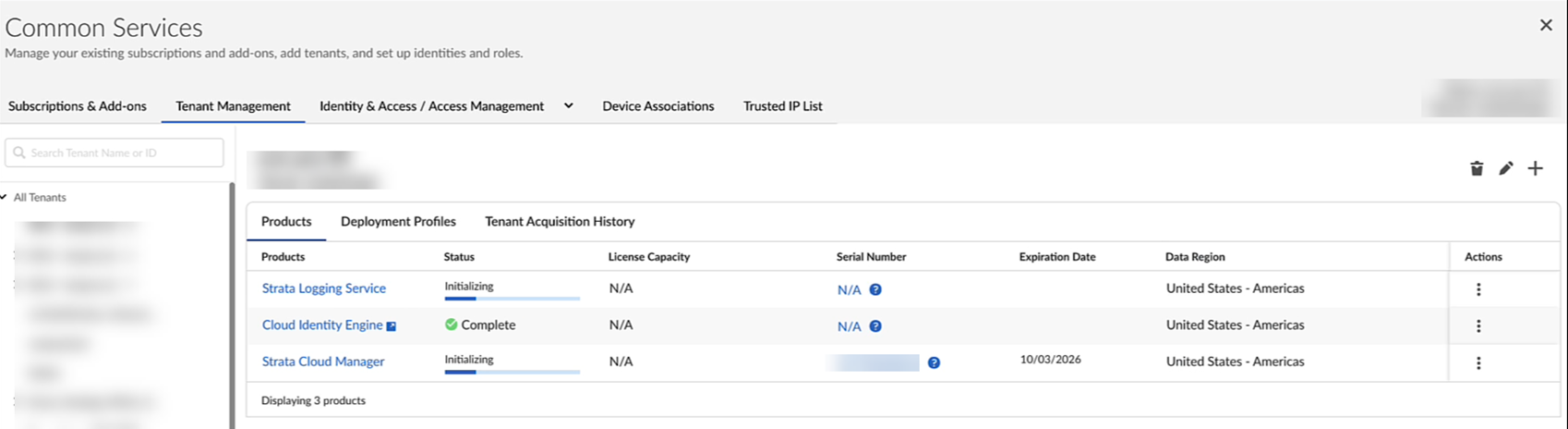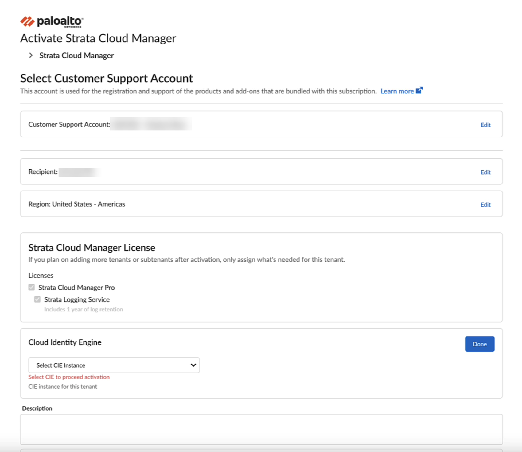 - After you receive an email from Palo Alto Networks identifying the Strata Cloud Manager Pro license you're activating, click the email link to begin the activation process.Choose the Customer Support Account that you want to use.Select Tenant where you will activate Strata Cloud Manager Pro. If you don't have an existing tenant, Create New.Select a Region where you want to deploy Strata Cloud Manager. See the supported regions for Strata Cloud Manager.Strata Cloud Manager Pro includes Strata Logging Service with one year of log retention.![]() Select Cloud Identity Engine or create a new CIE instance to identify and verify all users across your infrastructure.Agree to the Terms and Conditions, and Activate.Wait for Strata Cloud Manager, Cloud Identity Engine, and Strata Logging Service to initialize, and for Status to show Complete. Select Cloud Identity Engine or create a new CIE instance to identify and verify all users across your infrastructure.Agree to the Terms and Conditions, and Activate.Wait for Strata Cloud Manager, Cloud Identity Engine, and Strata Logging Service to initialize, and for Status to show Complete.![]() Associate NGFWs, Panorama, or both to a tenant containing your Strata Cloud Manager.Make sure to individually associate all the firewalls managed by Panorama to the tenant. Associate NGFWs, Panorama, or both to a tenant containing your Strata Cloud Manager.Make sure to individually associate all the firewalls managed by Panorama to the tenant.- Navigate to Common Services > Device Associations.