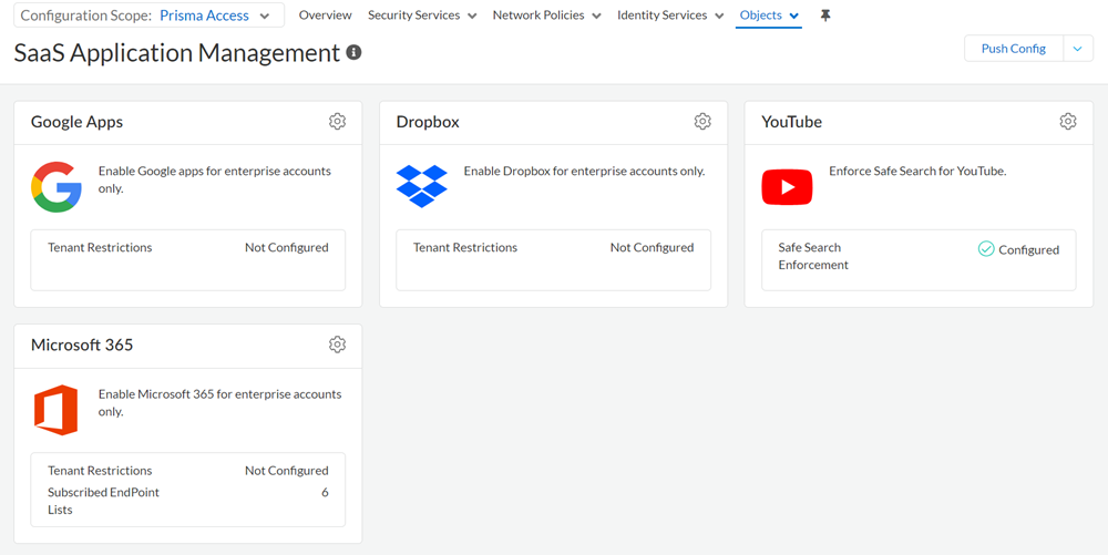 To manage Microsoft 365 usage, go to ManageConfigurationNGFW and Prisma Access. Select Prisma Access configuration scope,