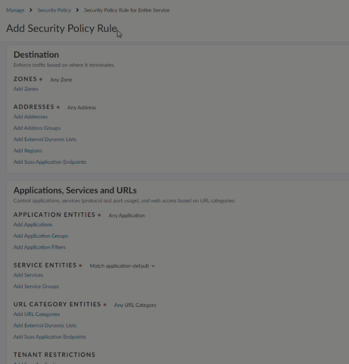 Add the endpoint list to a security policy ruleYour subscribed lists are available for you to use as match criteria in a security policy rule.- Go to ManageConfigurationNGFW and Prisma AccessSecurity ServicesSecurity Policy and add or edit a rule.Add SaaS Application Endpoint lists as match criteria for the rule.