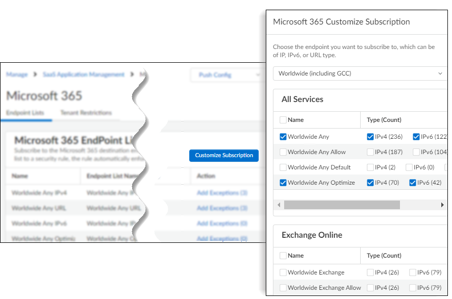 - Edit Microsoft 365 settings and go to Endpoint Lists.Select Customize Subscription and choose the endpoint lists you want to subscribe to, based on the services you’re using and the list type (IPv4, IPv6, or URL).