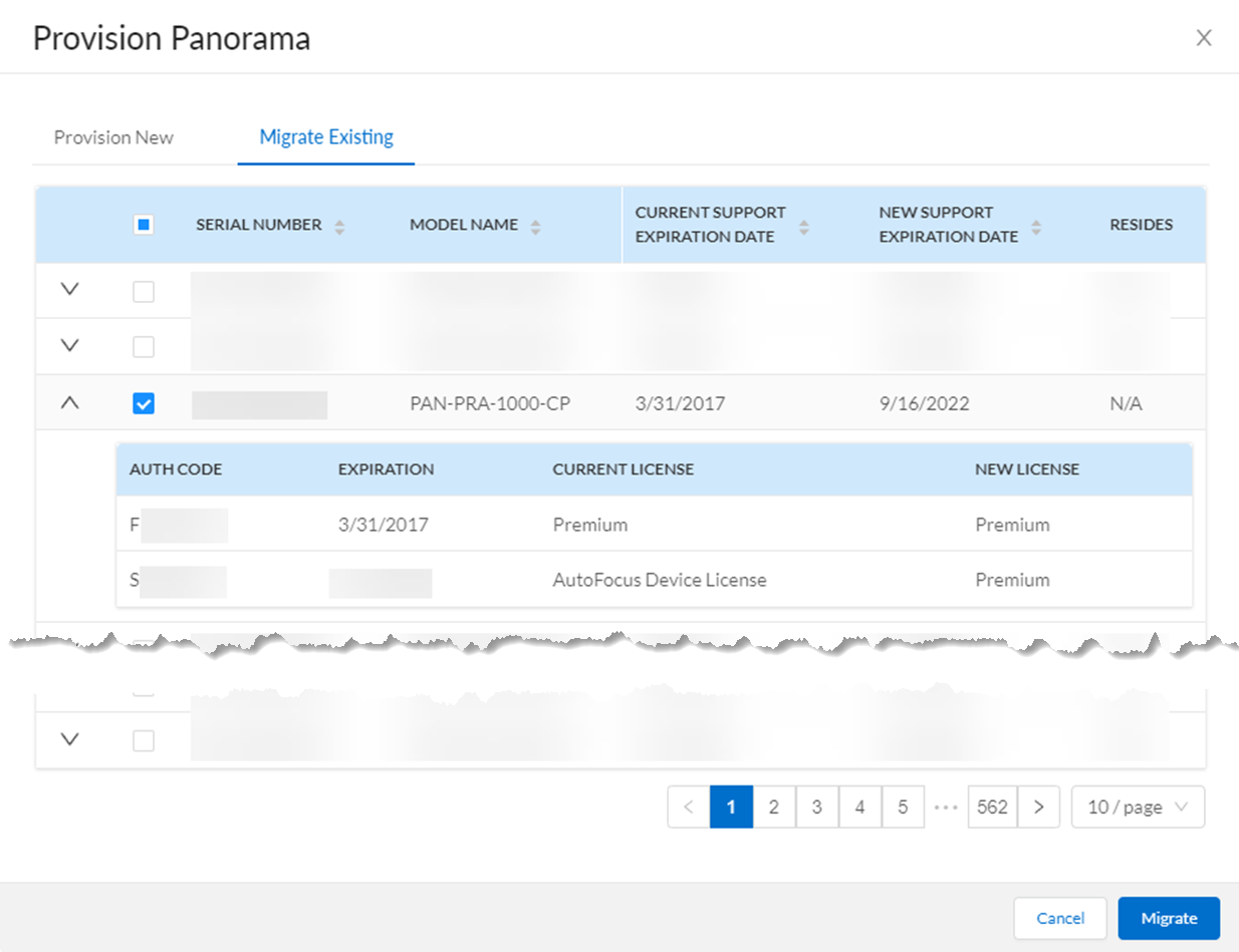 - Click Migrate.Verify that the Current Support Expiration Date has been updated. Additionally, you can expand each line to view the individual licenses applied to the selected Panorama.![]()