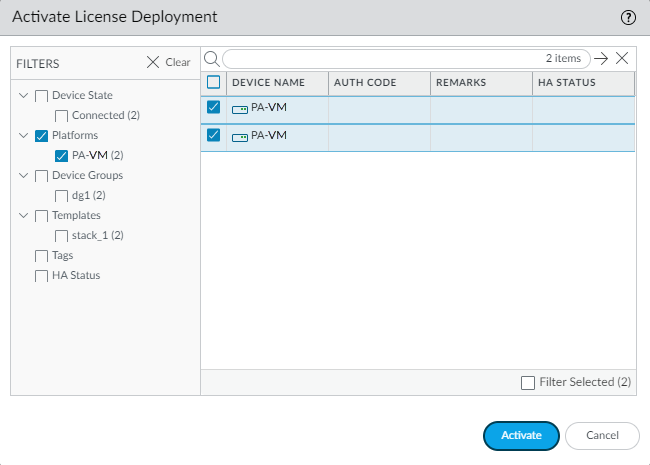 - Select PanoramaDevice DeploymentLicenses and click Activate.