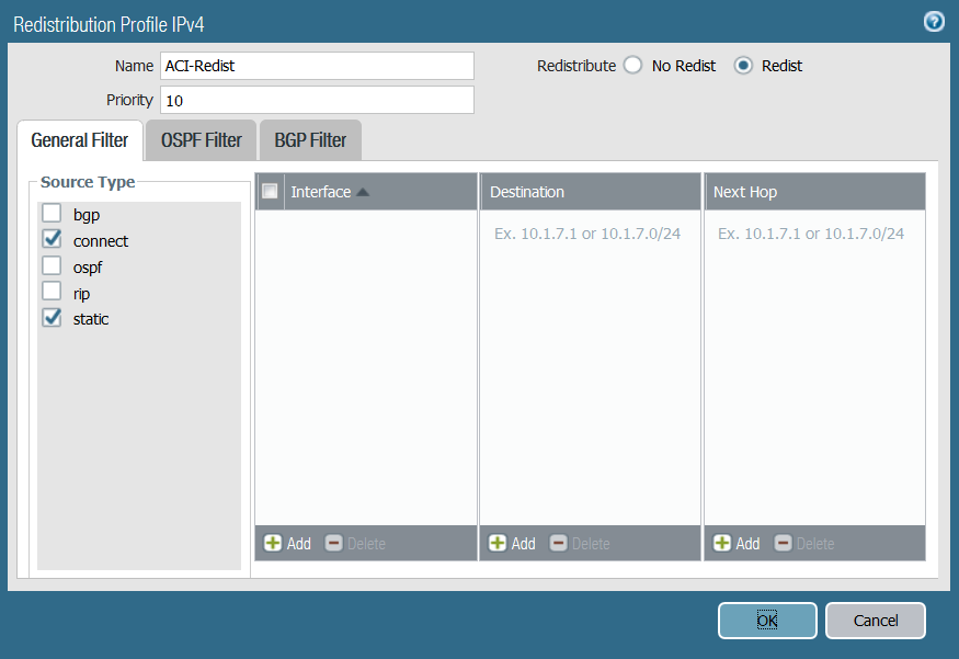 - Select the Redistribution Profile you created above from the Name drop-down and click OK.