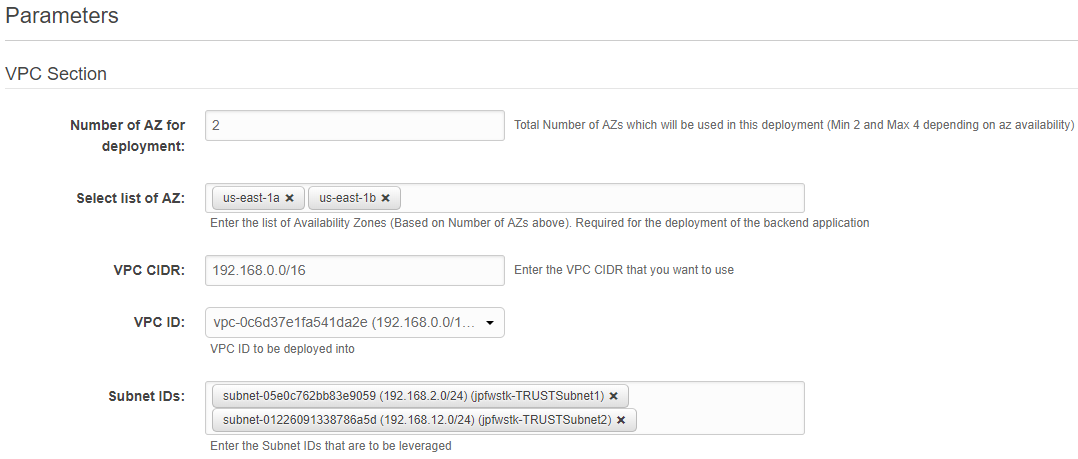 balancer.- Select the two Availability Zones that your setup will span in Select list of AZ. If you are deploying within the same VPC make sure to select the same Availability Zones that you selected for the firewall template.