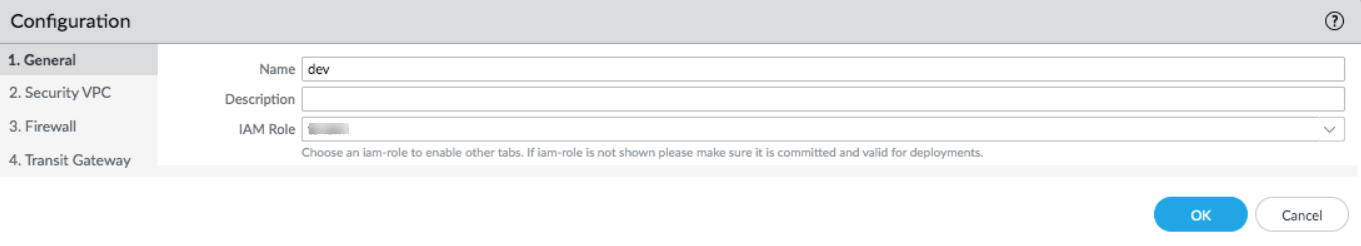 - Enter the generic details of the deployment in the General tab.- Enter a Name and an optional Description to identify the deployment in Panorama and AWS cloud.