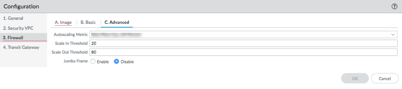 details.- Autoscaling Metric—Choose a metric from the drop-down: Data Plane CPU Util Percent (default), Active Sessions, Data Plane Packet Buffer Util Percent, or Session Util Percent.