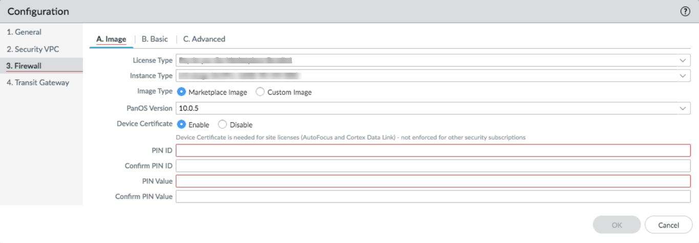 - Image Type—Select Marketplace Image or Custom Image.If you select Marketplace Image, select from the drop-down, PanOS Version 10.0.5 or later supported in the regions you selected when you configured the Security VPC.If you select Custom Image, enter the Amazon Machine Image (AMI) ID and select a PanOS Version 10.0.5 or later.
