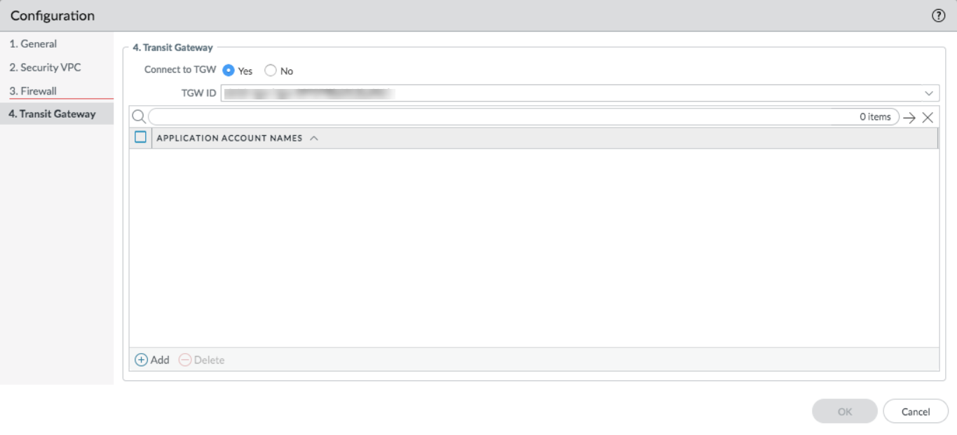 for RAM on the account you select here.If the TGW and Security VPC are in the same account, select an Application account with which you want to share the TGW. If the TGW is in an Application account, make sure that the TGW is shared on RAM.If the TGW is in an Application account (other than the Security account):- Make sure the TGW is shared with the Security account.