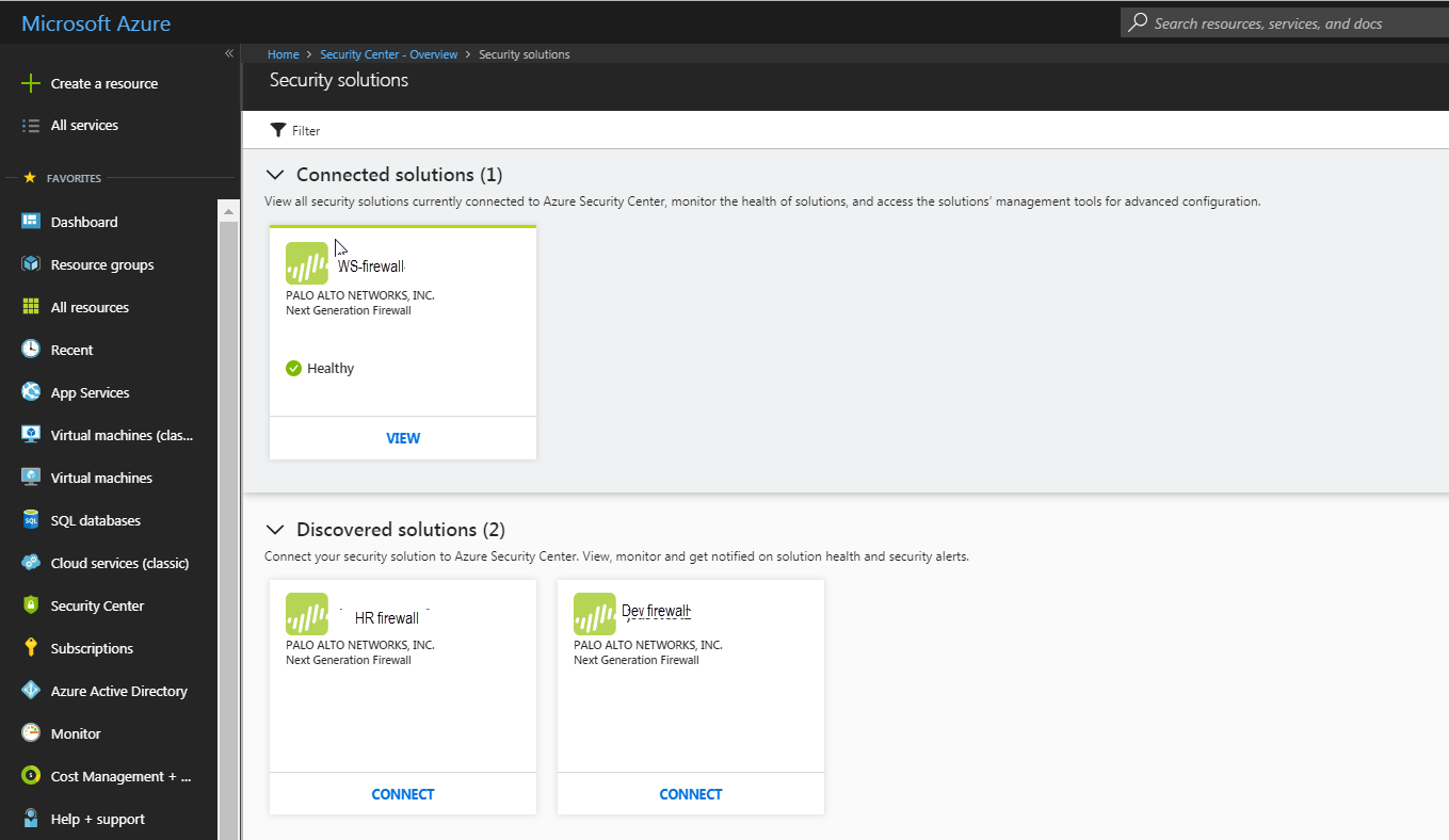 When the Azure Security Center dashboard recommends that you deploy a VM-Series firewall to secure a workload that is exposed to the internet, you can only deploy the firewall in an new resource group or an existing resource group that is empty. This is because Azure currently restricts you from deploying a multi NIC appliance in an existing resource group. Therefore, after you deploy the VM-Series firewall you must manually configure it to be in the path of traffic of the workload that you need to secure.When you deploy the firewall from Azure Security Center, the firewall is launched with three network interfaces—management, external facing (untrust) and internal facing (trust)—and a user defined route (UDR) that sends all outbound traffic from the trust subnet to the trust interface on the firewall so that internet-bound traffic is always inspected by the firewall. The default configuration includes two example Security Policy rules—the outbound-default rule allows all traffic from the trust zone to the untrust zone on the application default port, and the inbound-default rule allows all web-browsing traffic from the untrust zone to the trust zone, after inspecting traffic with the default Antivirus, Anti-spyware, and Vulnerability Protection security profiles. The firewall also forwards all files that are intercepted with the inbound or outbound rule to the WildFire public cloud for analysis. Both rules include a URL Filtering profile that blocks all traffic to the URL categories copyright-infringement, dynamic-dns, extremism, malware, phishing, and unknown. In addition to these security profiles, both Security policy rules are enabled to log at session end and to forward Threat and WildFire Submissions logs as security alerts to the Azure Security Center dashboard.To make practical use of this integration and Deploy a VM-Series Firewall Based on an Azure Security Center Recommendationwithin the same resource group as the workloads you want to secure, you can stage a workload with a public IP address that is exposed to the internet. When Azure Security Center detects the security risk, it triggers a recommendation to deploy a next-generation firewall, and you can then deploy the VM-Series firewall in a new resource group into which you can add your workloads later. You must then delete the workload that you staged to trigger the recommendation. - Select a VM-Series firewall that you have already deployed for securing your workloads. If you have a Standard tier of Azure Security Center subscription, Azure Security Center discovers and displays all existing VM-Series firewalls that you have deployed either from the Azure Marketplace or using a customized deployment with Azure CLI, PowerShell or ARM template. The firewalls within your Azure subscription are grouped under Security Solutions on the Azure Security Center dashboard.Microsoft Azure does not support the discovery of existing firewalls with the Free tier subscription.