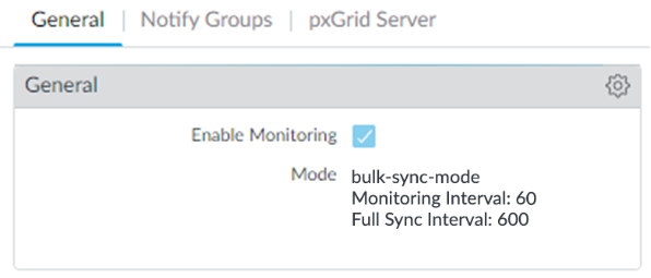 - Monitoring Interval (Bulk Sync only)—10 to 86400 seconds, default is 60—Set the polling interval at which Panorama queries the pxGrid server for endpoint address information. This is the time period between the end of a monitoring event and the start of the next event.