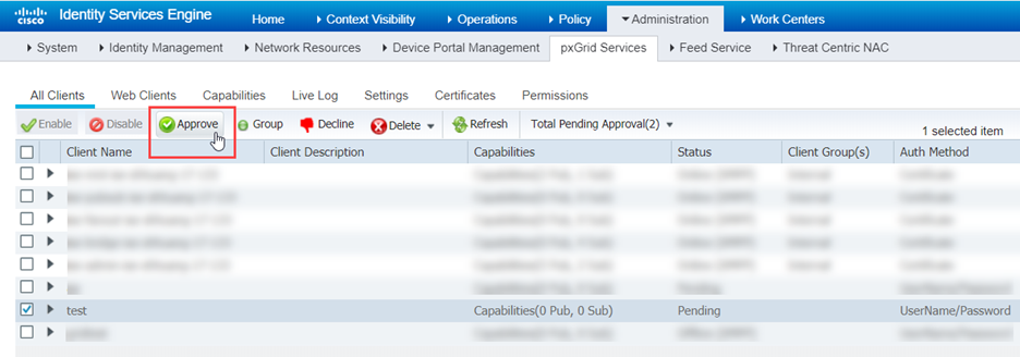 Log in to your Cisco ISE server to approve the account.Select AdministrationpxGrid ServicesAll Clients.Select the client name you create on Panorama.Click Approve.