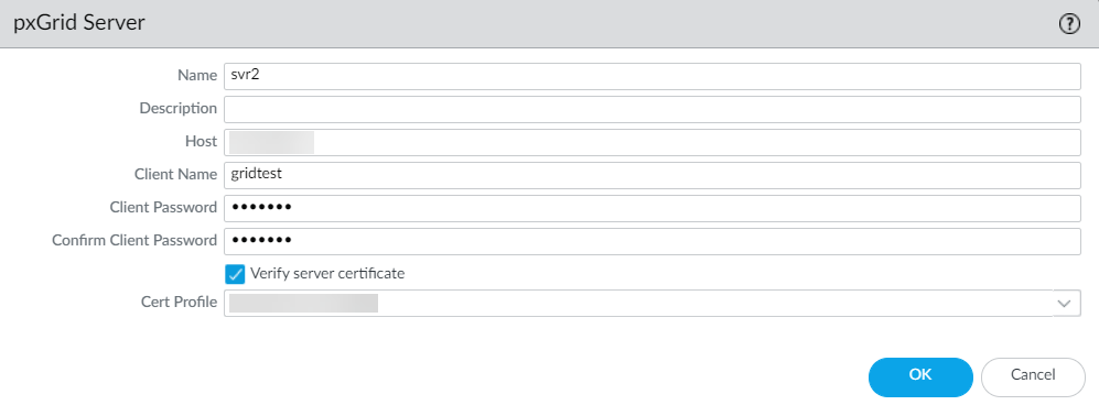 Add pxGrid server information. The Panorama plugin for Cisco TrustSec supports up to 16 pxGrid (Cisco ISE) servers.- Select PanoramaCisco TrustSecSetuppxGrid Server.Enter a descriptive Name for your pxGrid server.In the Host field, enter the IP address or FQDN for your pxGrid server.Enter the client name you created in the previous step.Enter and confirm the client password you generated in the previous step.Verify the pxGrid server identity.