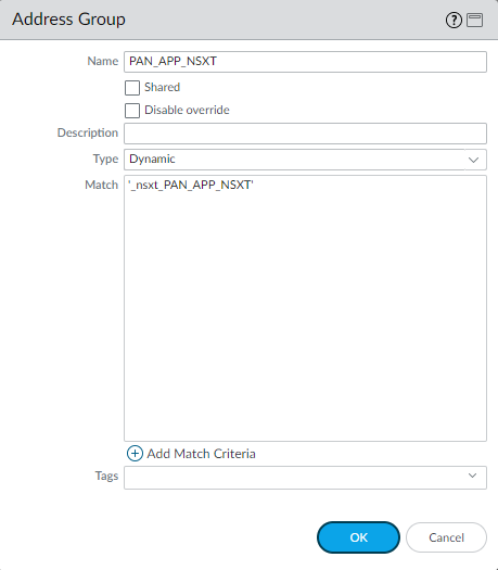 - Edit the match criteria.For the dynamic address group to become a security group in NSX-T Manager, the match criteria string must be enclosed in single quotes with the prefix _nsxt_ followed by the exact name of the Address Group. For example, ‘_nsxt_PAN_APP_NSX’.