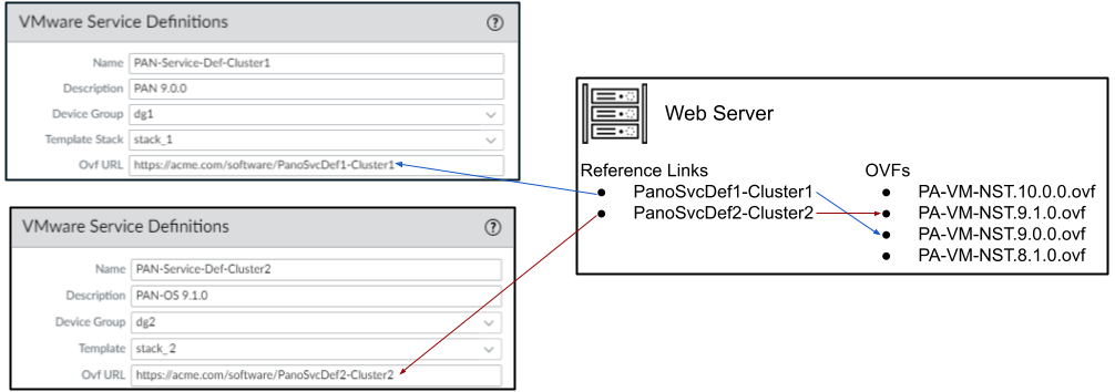 - Specify the location of the OVF file.Download the zip file, unzip it to extract and save the .ovf, mf and .vmdk files to the same directory. The ovf and vmdk files are used to deploy each instance of the firewall.If needed, modify the security settings on the server so that you can download the file types. For example, on the IIS server modify the Mime Types configuration; on an Apache server edit the .htaccess file.Do not change the Panorama service definition OVF path after a successful NSX Service Deployment of VM-Series firewalls. Changing the OVF path, after a successful VM-Series firewall deployment, can result in a NSX Service Deployment failed state. You may resolve this failure in NSX-T Manager, however this may cause all VM-Series firewalls to redeploy.It is recommended that you use an OVF path name that scales and allows you to change the base image without impacting your deployed firewalls. Instead of a path such as https://acme.com/software/PA-VM-NST.9.1.0.ovf, use something such as https://acme.com/software/PanoSvcDef1-Cluster1.ovf. Using a static path reference will eliminate any future need to change the OVF path. It is recommended to create a path for each Panorama service definition (vSphere cluster) in your deployment and change the PAN-OS base images references on the web server as needed.