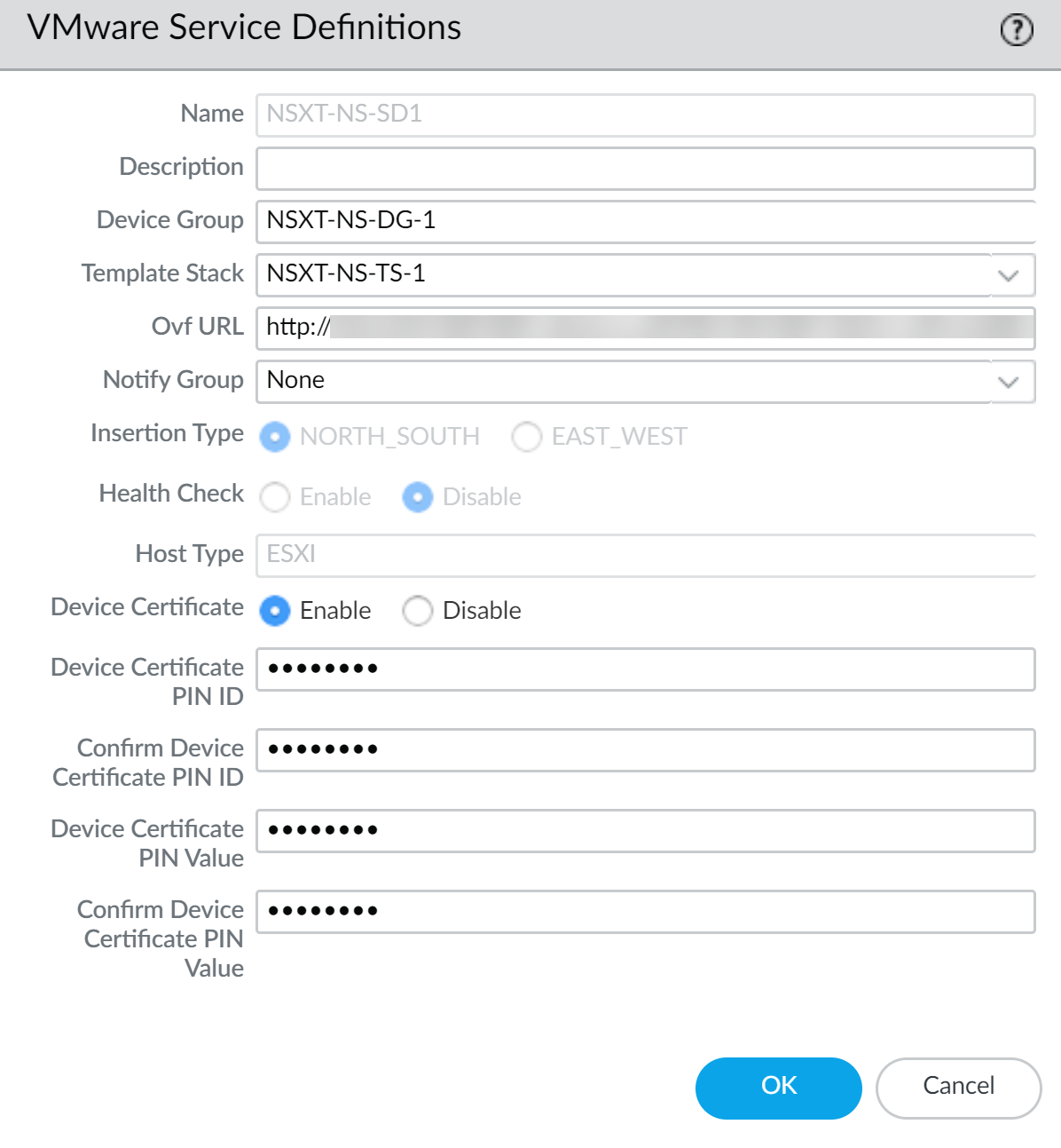 In OVF URL, add the location of the web server that hosts the ovf file. Both http and https are supported protocols.Panorama must have network connectivity with the web server to retrieve the OVF file.You can use the same ovf version or different versions across service definitions. Using different ovf versions across service definitions allows you to vary the PAN-OS version on the VM-Series firewalls in different ESXi clusters. - Select North South as the Insertion Type for your firewall.