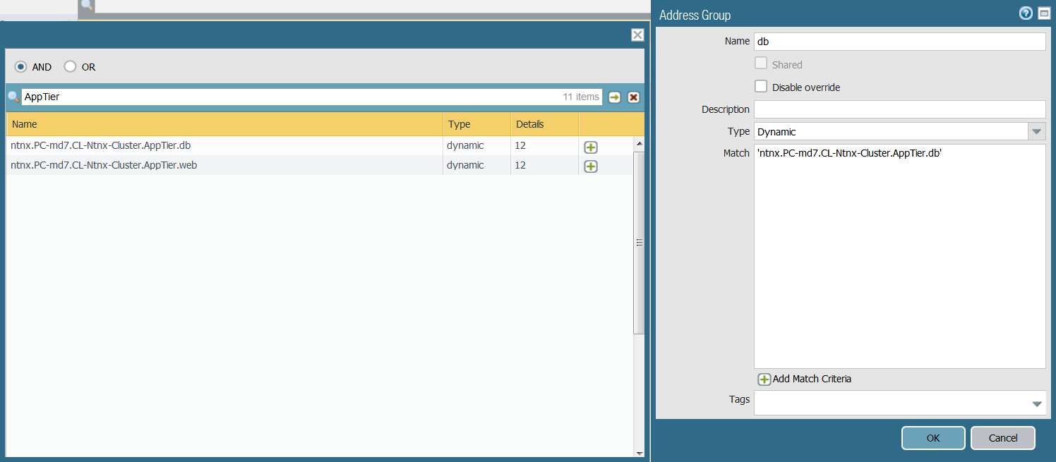 - Click Add Match Criteria. You can select dynamic tags as the match criteria to populate the members of the group. Select the And or Or operator and select the attributes that you would like to filter for or match against. and then click OK.