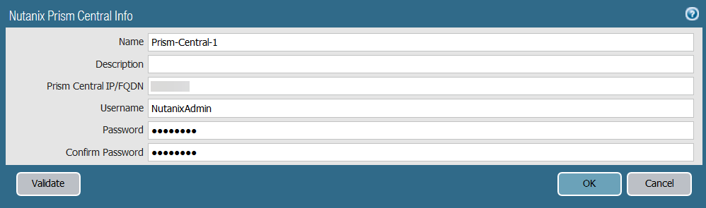 you entered the Prism Central credentials correctly.If you return to the Nutanix Prism Central Info window after clicking OK, clicking the Validate button returns a credential validation error message. This is the expected behavior. Although Panorama displays dots in the password field, the field is empty; this causes the validation to fail despite Panorama being successfully connected to Prism Central.