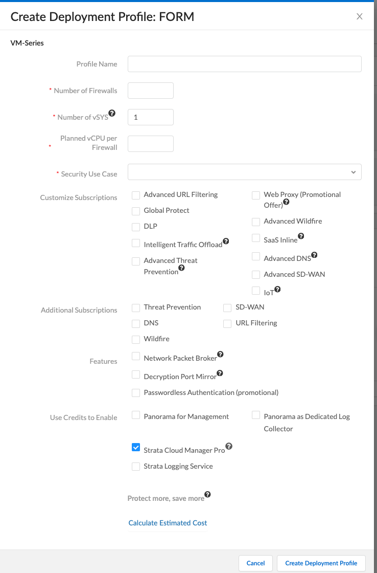 For information on the maximum number for a particular object or resource that a single VM-Series firewall deployment can create, store, manage, or interact with based on allocated memory or tier, see Maximum Limits Based on Tier and Memory.Firewall Model:Choose a VM-Series model.Planned vCPU/Firewall (PAN-OS 10.0.4 or above).Enter the number of vCPUs per firewall.Security Use Case: Choose a use case.Customize Subscriptions.After selecting a use case, you can add or remove security services.Select your Strata Cloud Manager subscription—Strata Cloud Manager Pro or Strata Logging Service. If you're using Strata Cloud Manager Essentials, do not select these options.